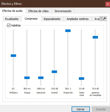 5- Ajustar el Ataque entre 50ms y 75ms y la Liberación entre 100ms y 250ms. Reproduzca la película y ajústela para obtener una reproducción de audio más uniforme